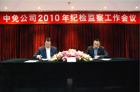 本次會(huì)議的主題是深入貫徹中紀(jì)委十七屆五次全會(huì)、國(guó)資委和國(guó)旅集團(tuán)2010年紀(jì)檢監(jiān)察工作會(huì)議精神,總結(jié)公司2009年黨風(fēng)建設(shè)和反腐倡廉工作,提出2010年工作要求,由公司黨委書記盧路分別與公司經(jīng)營(yíng)班子成員和部門以上負(fù)責(zé)人、在京子公司主要負(fù)責(zé)人簽訂2010年《廉潔從業(yè)責(zé)任書》。
