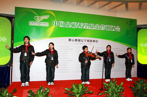 二月的北京,乍暖還寒。然而在北京國際飯店二層的陽光廳內(nèi)卻暖意融融,溫情無限! 作為2010年中國免稅業(yè)務(wù)工作會議中的主題公益活動——中國免稅希望基金答謝酒會在此隆重舉行。中免集團(tuán)領(lǐng)導(dǎo)班子全體成員和來自中免集團(tuán)下屬各零售店面的總經(jīng)理近200人參加了此次答謝活動。而為了讓震區(qū)的孩子們感受到全體中免人的真誠愛心,此次答謝活動還特意邀請了來自震區(qū)四川省資陽市雁江區(qū)丹山鎮(zhèn)牌坊中國免稅希望小學(xué)師生代表一行6人。