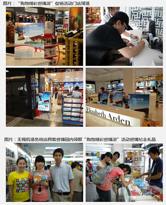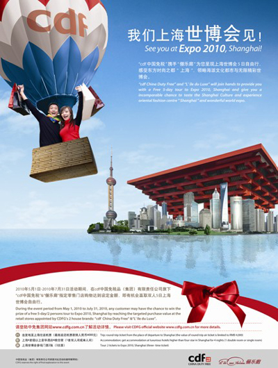 中免集團(tuán)利用2010年上海世博會(huì)所帶來的商機(jī),聯(lián)合集團(tuán)下屬零售門店及品牌供應(yīng)商進(jìn)行了以“購(gòu)物精彩世博游”為主題的聯(lián)合促銷活動(dòng)。活動(dòng)歷時(shí)4個(gè)月,從2010年5月1日開始,并于2010年8月31日精彩落幕。