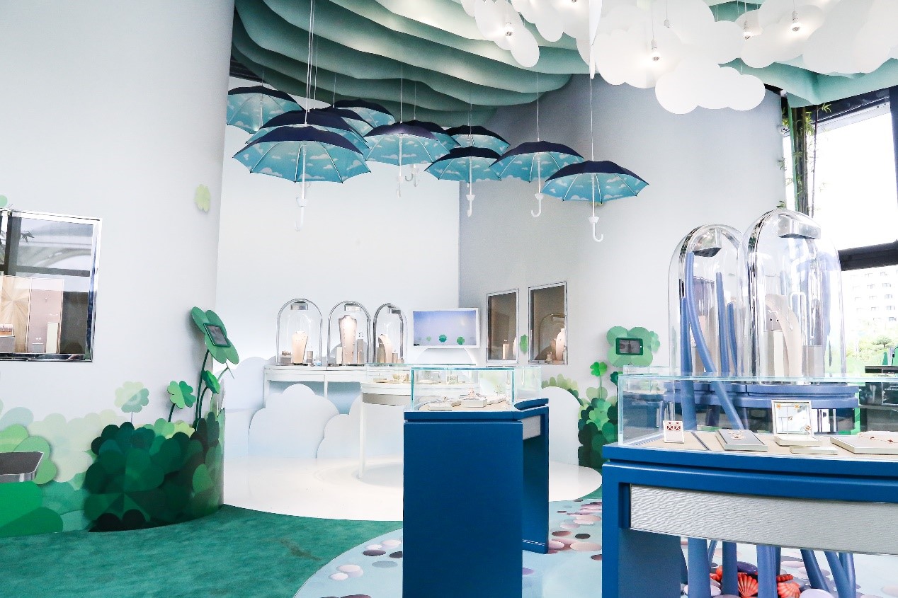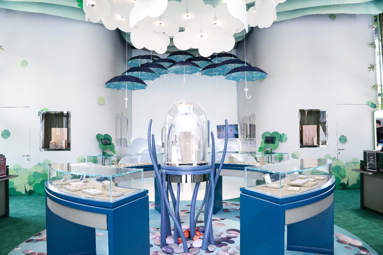 Van Cleef & Arpels梵克雅寶“Alhambra幸運(yùn)花園”免稅限時精品店位于三亞國際免稅城后廣場。世家要員雅克·雅寶Jacques Arpels常言道:“心懷幸運(yùn)之愿,方能成為幸運(yùn)之士?!毙疫\(yùn)是梵克雅寶一直以來十分珍視的價值,更是其創(chuàng)意靈感的泉源之一,因此限時精品店內(nèi)部設(shè)計以世家標(biāo)志性四葉幸運(yùn)圖案為主題,以延續(xù)這珍貴價值。進(jìn)店后,首先映入訪客眼簾的將是Burcu & Geoffrey 這對法國和土耳其的導(dǎo)演拍檔為Alhambra 特別創(chuàng)作的四葉圖騰造型蝴蝶沿途散播幸運(yùn)的種子,帶領(lǐng)游客穿梭在幸運(yùn)花園中,引領(lǐng)大眾一同探索夢幻迷人的Alhambra 幸運(yùn)花園, 為游客營造出一種舒適愉快的珠寶欣賞空間。
