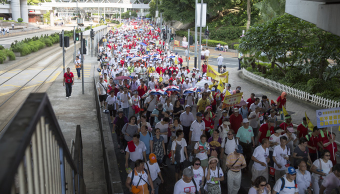 8月17日下午,在超過32度高溫的天氣情況下,集團(tuán)領(lǐng)導(dǎo)和在港各部司員工及部分員工家屬800余人,積極響應(yīng)香港中國(guó)企業(yè)協(xié)會(huì)的呼籲,參加了香港「保普選、反占中」大聯(lián)盟發(fā)起的「和平普選大遊行」,表達(dá)港中旅員工擁護(hù)「一國(guó)兩制」和基本法、依法實(shí)施普選的願(yuàn)望和訴求。張學(xué)武董事長(zhǎng)和姜巖董事副總經(jīng)理到維園集會(huì)現(xiàn)場(chǎng)為大家加油鼓勁,張逢春總會(huì)計(jì)師、許慕韓副總經(jīng)理等集團(tuán)領(lǐng)導(dǎo)和員工隊(duì)伍一起全程參加了遊行。