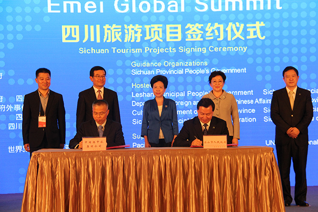 在簽約儀式上,港中投總經(jīng)理許慕韓與樂山市張彤市長簽訂了「關(guān)於合作開發(fā)樂山市、峨眉山市旅遊資源的戰(zhàn)略合作協(xié)定」。姜巖總經(jīng)理與四川省黃彥蓉副省長、省旅遊局郝康理局長和樂山市委唐堅書記作為證簽人見證了雙方協(xié)議的簽署。