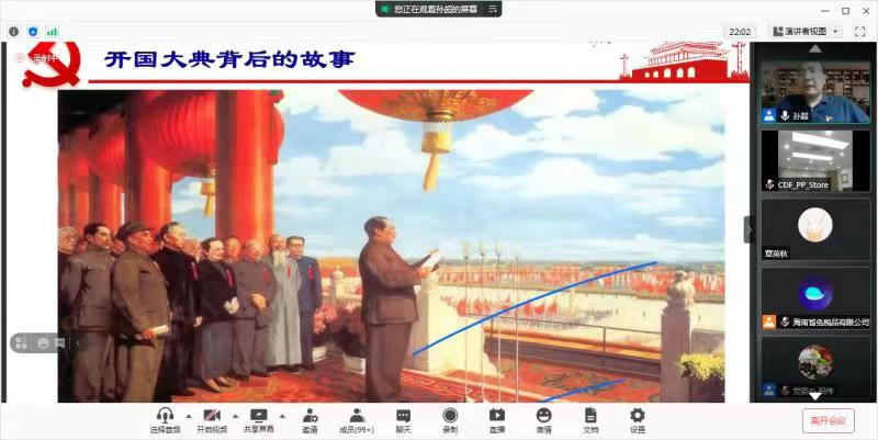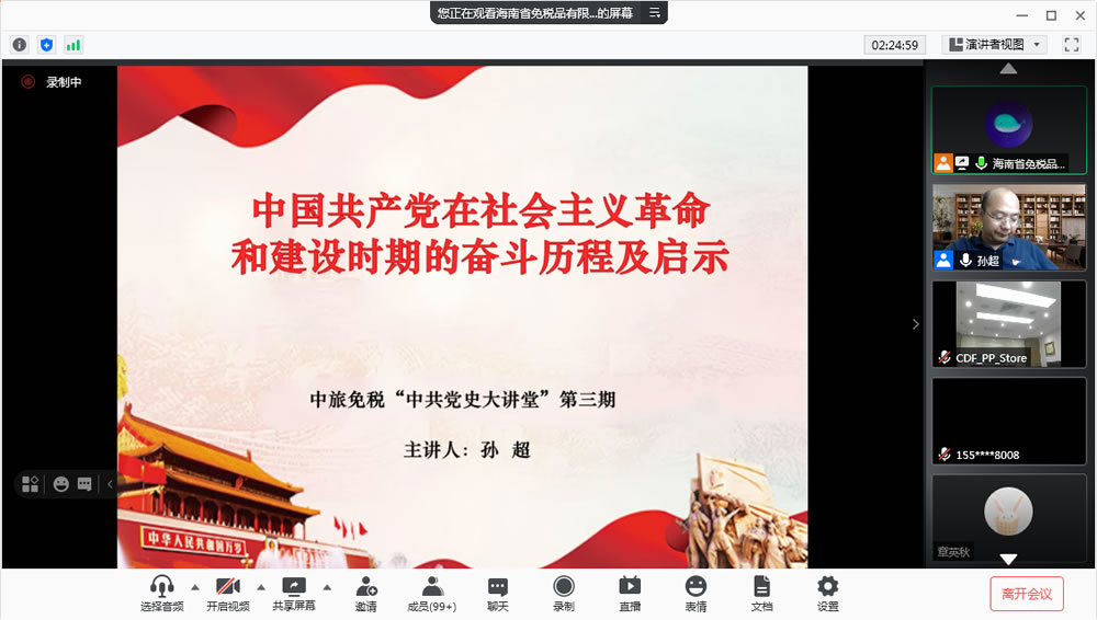 2021年5月27日,中旅免稅黨委舉辦第三期“黨史大講堂”專題培訓(xùn)。根據(jù)中旅免稅黨委“黨史大講堂”培訓(xùn)工作安排,此次活動由海南省免稅品有限公司黨委組織承辦,海南省免稅品有限公司黨委班子成員和機(jī)關(guān)黨支部全體黨員在會議室集中參加線上培訓(xùn),中旅免稅其他各級黨組織黨員和入黨積極分子共600余人通過視頻方式線上參會。