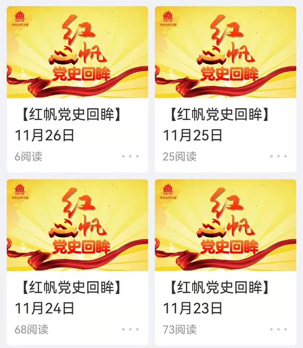 “紅帆工程”創(chuàng)建以來,始終發(fā)揮思想政治引領作用。在公司黨建微信公眾號先后開辟了“紅帆學習”“紅帆課堂”“紅帆講習堂”欄目,適時推送習近平新時代中國特色社會主義思想學習內容、習近平總書記的重要講話、重要指示批示精神以及集團公司、股份公司最新指示精神,共發(fā)送各類推文100余篇。2021年黨史學習教育期間,為進一步引導公司員工學黨史、知黨情、跟黨走,在公司OA辦公系統(tǒng)、美篇上設置“紅帆黨史回眸”專欄,每日通過系統(tǒng)和微信群向黨員推送“黨史回眸”學習資料220篇。相應欄目的開辦,進一步強化了思想政治引領作用,激發(fā)了員工愛黨愛國的巨大熱情,凝聚了員工士氣,提升了黨建工作實效。