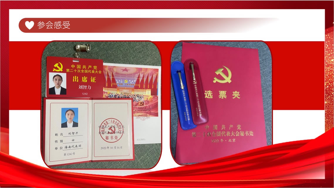 “作為一名海南離島免稅行業(yè)基層一線的青年黨員,能夠親歷這次具有重大里程碑意義的盛會,我感到十分榮幸、也十分振奮。這是我第一次去到北京,第一次走進人民大會堂。會議期間,我和海南代表團其他24名參會代表,認(rèn)真聽取學(xué)習(xí)討論了黨的二十大報告。”劉智力表示,大會報告主題鮮明、內(nèi)容全面,擘畫的中國發(fā)展藍圖,特別是關(guān)于海南自貿(mào)港建設(shè)的部署,讓人倍感振奮。作為參與海南自貿(mào)港建設(shè)的一份子,劉智力表示,要做好黨的二十大精神的宣傳員,把黨的二十大“好聲音”送到大家的心坎上,同時做好黨的二十大精神的踐行者,把“誠信經(jīng)營、優(yōu)質(zhì)服務(wù)”理念融入到每一次對客服務(wù)中,讓每一位消費者乘興而至、滿意而歸,在平凡崗位中為海南自貿(mào)港建設(shè)貢獻青春力量。