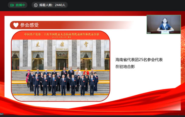 宣講會上,她分享了參加黨的二十大的所見所聞所感,并從新時代青年、基層黨員、海南旅游零售行業(yè)從業(yè)者三個身份,就如何貫徹黨的二十大精神分享學(xué)習(xí)體會。