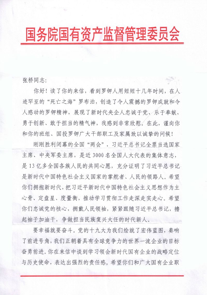郝鵬書(shū)記收到這封千里之外的基層青年的來(lái)信后,在百忙之中親自寫(xiě)了回信。郝鵬書(shū)記在回信中對(duì)羅鉀人在羅布泊創(chuàng)造的成就、羅鉀人身上展現(xiàn)出來(lái)的新時(shí)代央企人的精氣神感到非常欣慰,并向廣大一線干部職工表達(dá)了衷心的祝賀和美好的祝福。